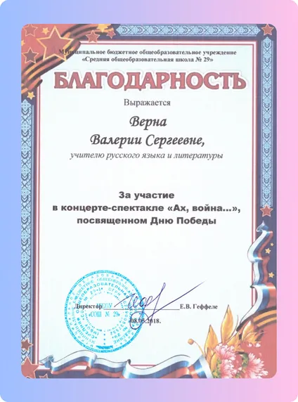 Валерия, здравствуйте! Хочу выразить Вам свою благодарность за ваши уроки. Я весь год пользовалась Вашими уроками по литературе в 9 и 6 классах. Результат был отличным: 6 классники написали ВПР по литературе на 4 и 5, троек было мало, а в 9 классе девочки сдали огэ на "5". Большое Вам спасибо 🙏!!! На сл. уч. год планирую приобрести у Вас 5 класс и 7...😊