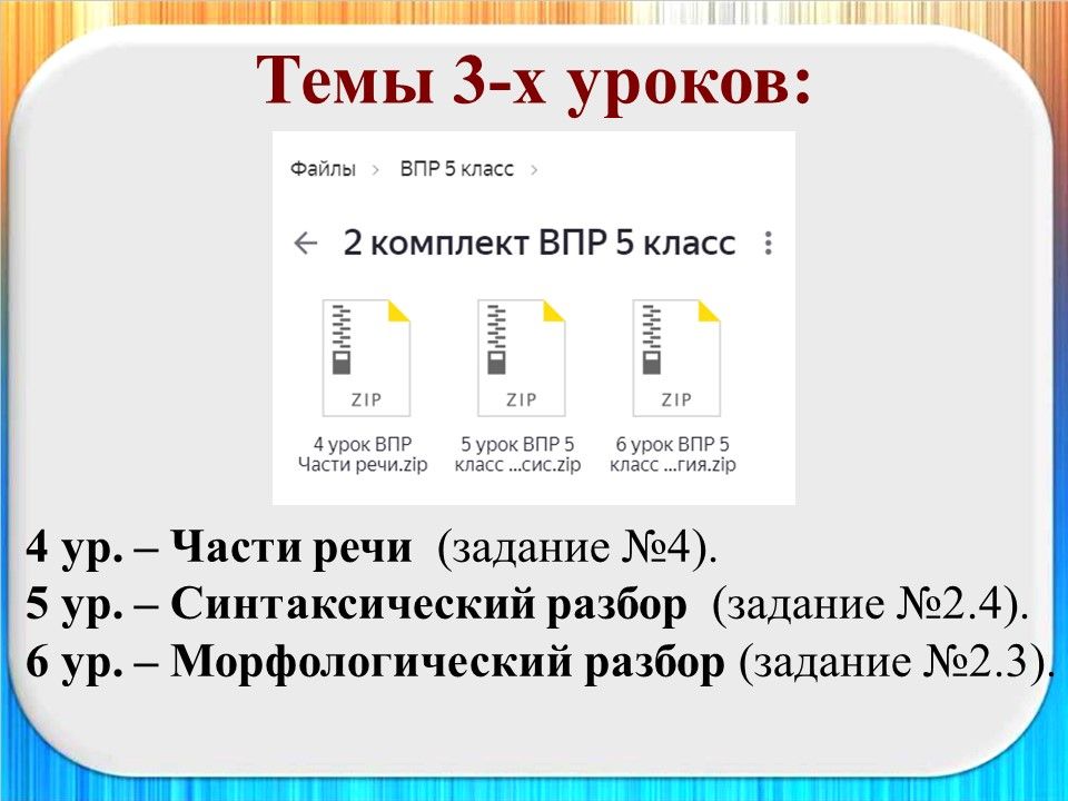 Уроки по подготовке к ВПР в 5-м классе. Комплект состоит из 3-х уроков. Каждый урок находится в отдельной папке. В папке есть конспект, презентация, рабочий лист и домашнее задание.